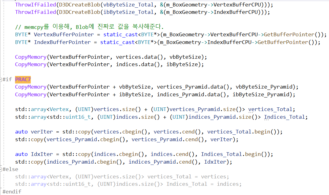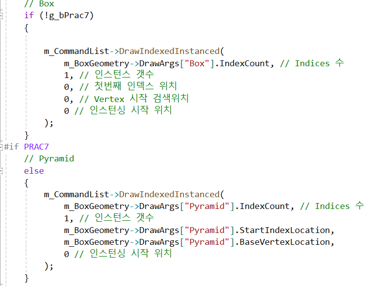 (CB 업로드 버퍼를 새로 만드는 것도 이상하고, Box를 그리고 Flush()를 하고, CB값을 바꾸고 피라미드를 출력하는 것도 이상해서... 결론은 Instancing을 제대로 배워서 하는게 나을 것 같아, 마우스 클릭을 하면 박스와 피라미드를 번갈아 가면서 렌더링 하는 것으로 타협했습니다.)