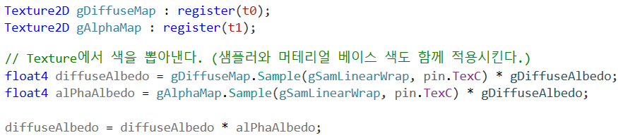 - Shader에 Texture2D 타입의 텍스쳐 리소스와, SamplerState 타입의 샘플러가 넘어온다고 했다.