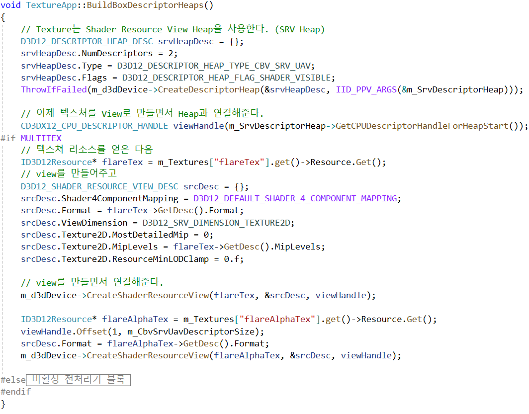 - 예제에서는 Texture Resource를 Shader 에게 D3D12_DESCRIPTOR_HEAP_TYPE_CBV_SRV_UAV 전용 힙을 만들어서 Table로 넘겨준다. (Buffer로 넘겨주려면 넘겨줄 수 있겠지만, 예제에서는 그렇게 하지 않았다.)