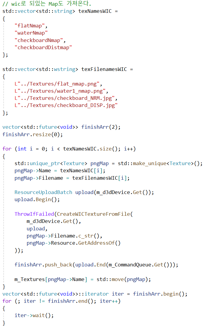 - 이전과 비슷한 방식으로 wave Texture View 만들고... 쉐이더 컴파일하고, PSO 만들고, Material 만들고/업데이트하고, RenderItem 만들고... 그냥 그렇게 했다.