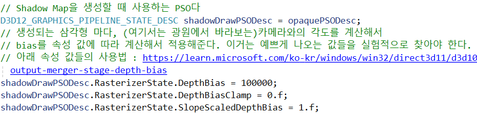 - 그래서 shadow map을 그리는 PSO에 RasterizerState 값을 설정해주어야 한다.