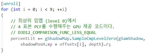 - 이 친구도 그림자 맵과 본 카메라 렌더링의 해상도 차이로 인해 생기는 그림자 판정 문제를 해결하기 위한 방법이다.