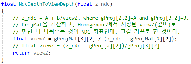 - 타겟 픽셀과 무작위 Ray에 맞은 Depth Map에 해당하는 픽셀 위치를 View 공간으로 변환한 뒤에 Occlusion을 계산한다.