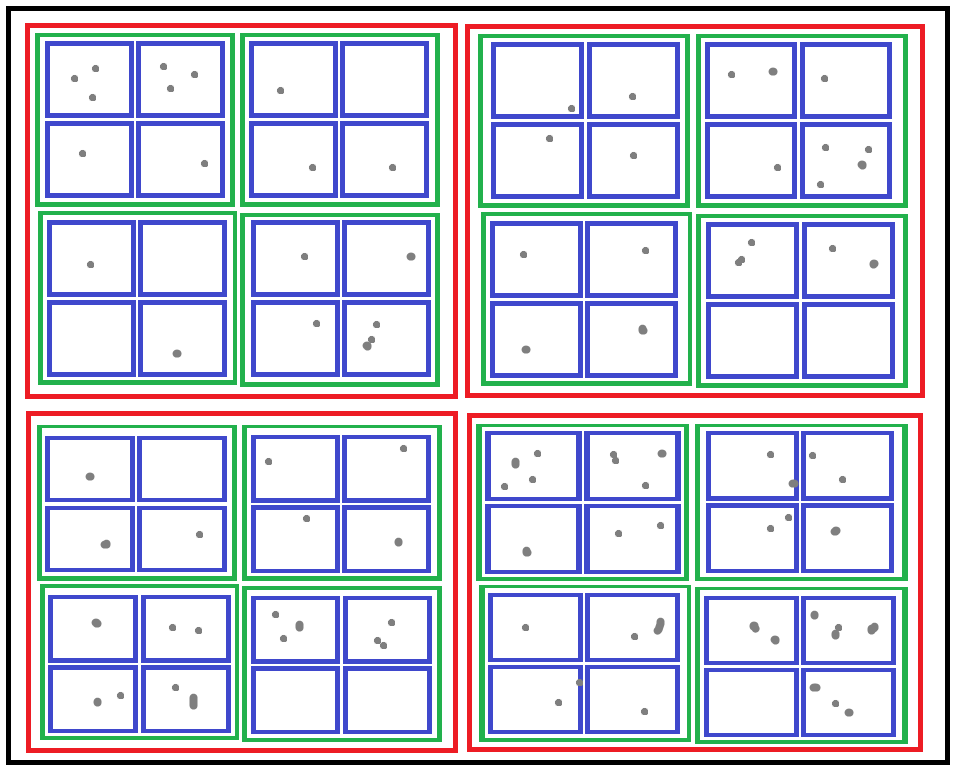 - 그리고 그 아래 hierarchy는 그 사분면 끼리 모인점들을 또 4사분면으로 나눠서 끼리끼리 모아놓는 것이다.