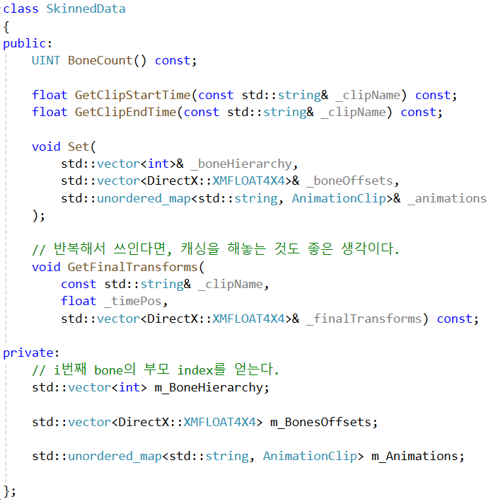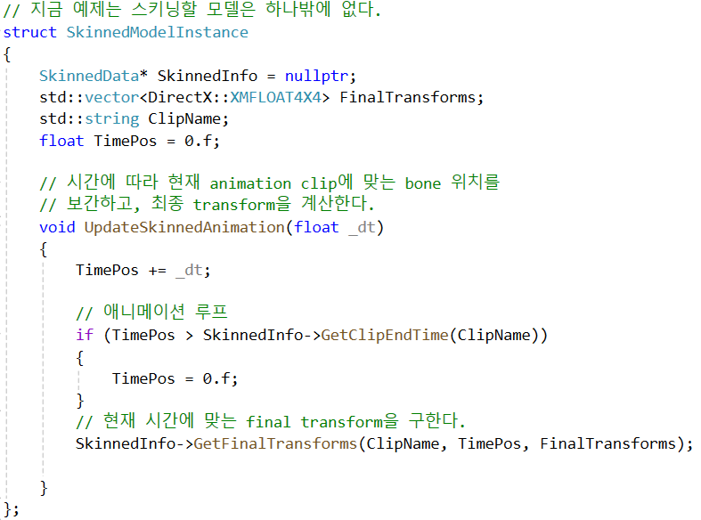 - 구조체 맴버로는 : Skin Mesh 데이터 구조체, 최종 bone의 위치, 애니메이션 메타정보, (애니메이션 용 시간)을 가진다.