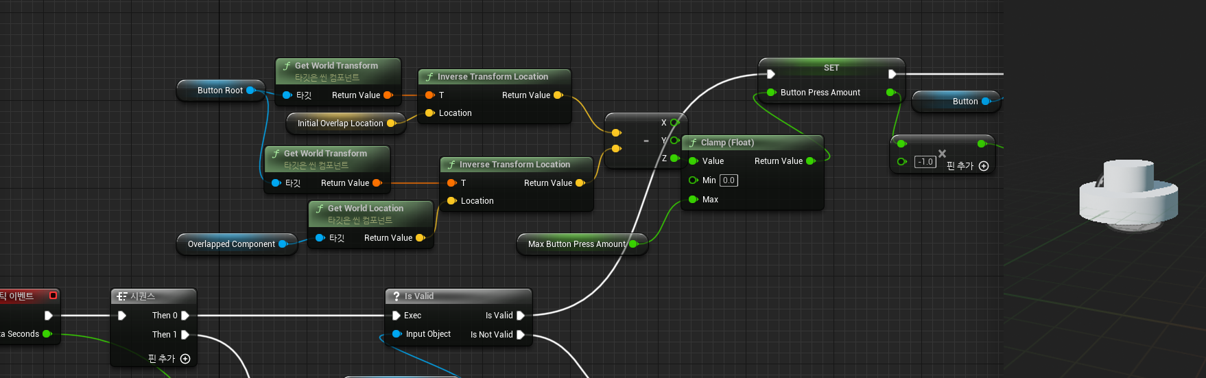 학기 중에 급하게 VR 컨텐츠를 하나 만들어야 할 일이있어서, 강의 하나와 책하나를 사서 급하게 짜집기 해서 만든 마법(?)의 엘리베이터 이다. 책 : Unreal Engine VR Cookbook HTML 삽입 미리보기할 수 없는 소스 실제 VR Controller의 (꾸준한) 움직임은 맵과 항상 상호작용하는 것이 아니라고 한다. 위 영상은 버튼을 구현한 것인데, 본인만의 Interaction component와 overlap event를 짬뽕하여서 버튼을 역할과 모션(?)을 구현한것 - 눌리는 부분 (overlap event) - 받침 부분 (root) 무튼 눌리는 버튼 부분에 내 controller에 달린 interaction component가 들어가면 저렇게 button에 잡히게 된다. 그리고 ..